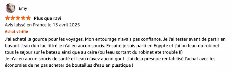 Cette gourde filtrante obtient la note de 4,4/5 sur Amazon.